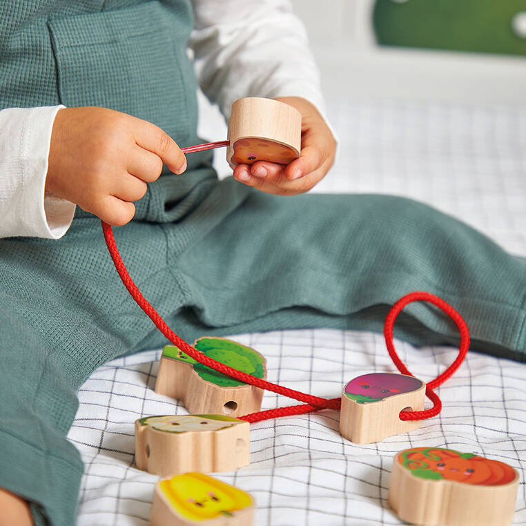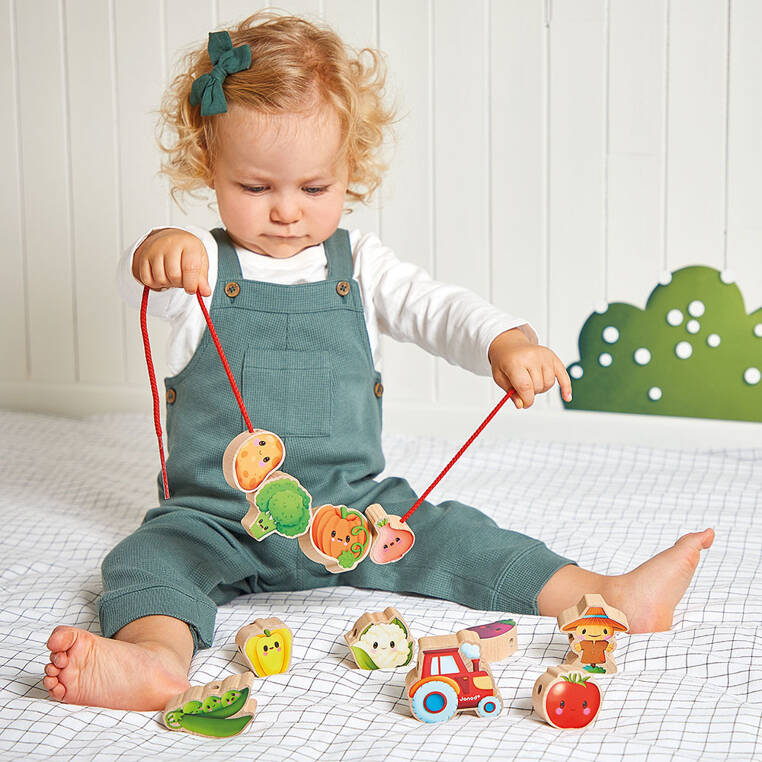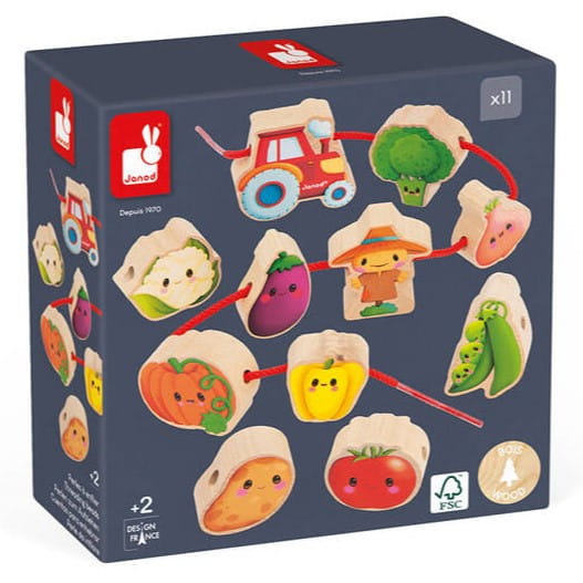 W zestawie są dwa czerwone sznurki z laminowanymi końcówkami, na które można nawlekać drewniane elementy: 9 warzyw (m. in. groszek, bakłażan czy dynia), traktor, strach na wróble, tworząc przy tym różne opowieści z życia na farmie.