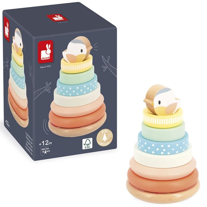 Piramidka z ptaszkiem i drewnianymi kółeczkami z serii Pure francuskiej marki Janod.