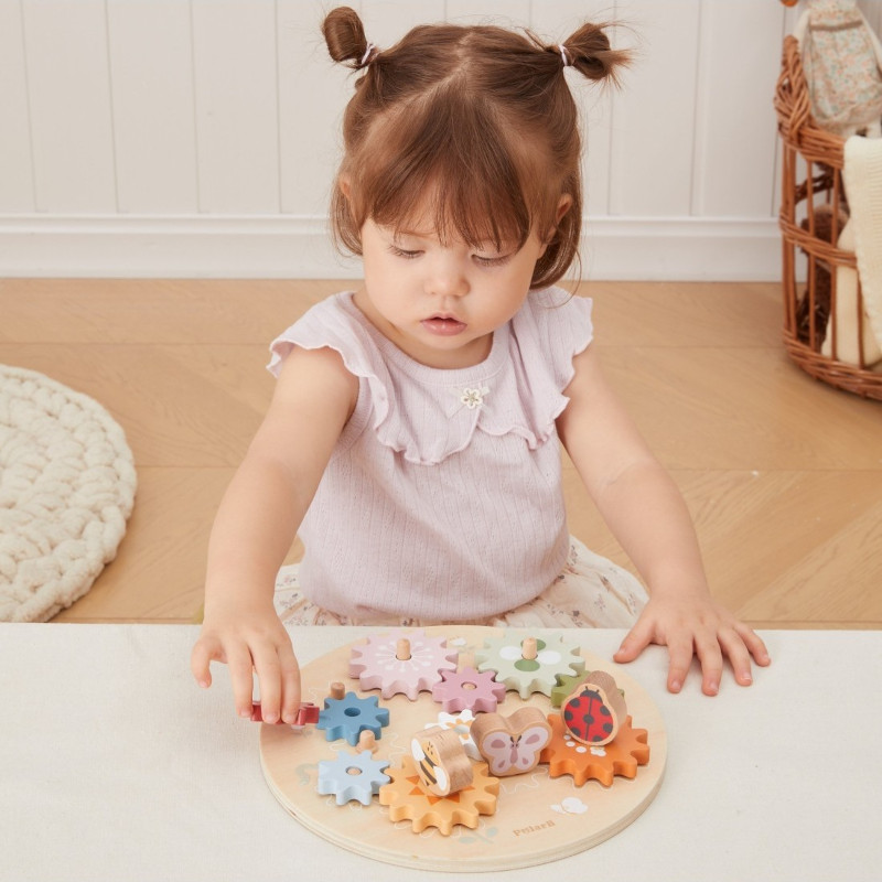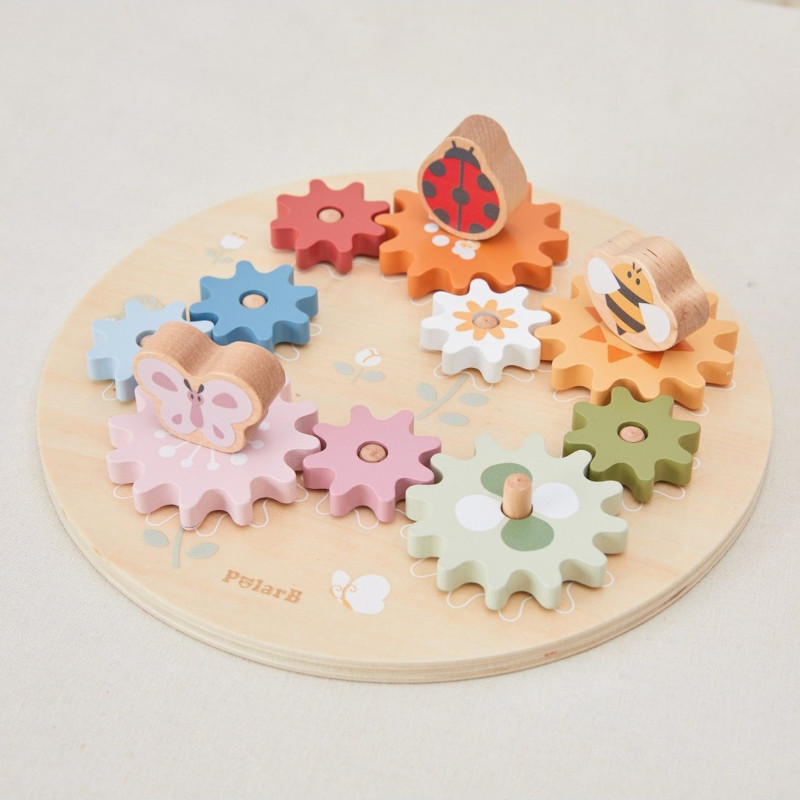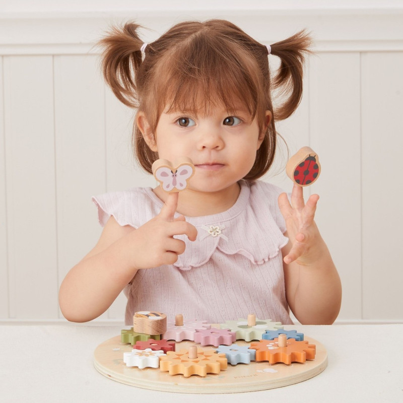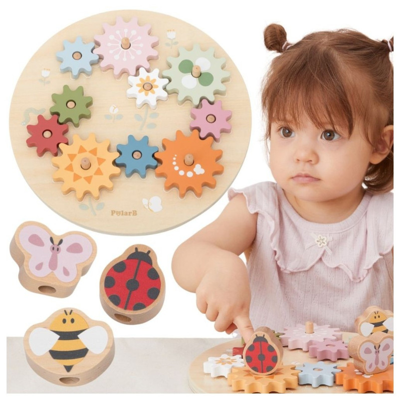 Ta kolorowa zabawka składa się z 10 kół zębatych, które dziecko układa, tworząc poruszający się mechanizm – świetna zabawa połączona z nauką!