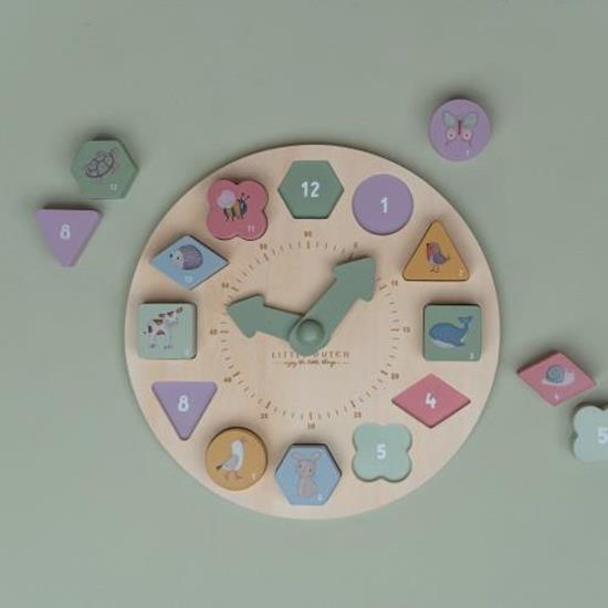 Zegar-puzzle Little Dutch pomaga dzieciom rozpoznawać kolory, liczby i kształty. Dzięki razem z nim uczą się liczyć i rozpoznawać liczby oraz kolory, umieszczając odpowiedni klocek we właściwym miejscu.