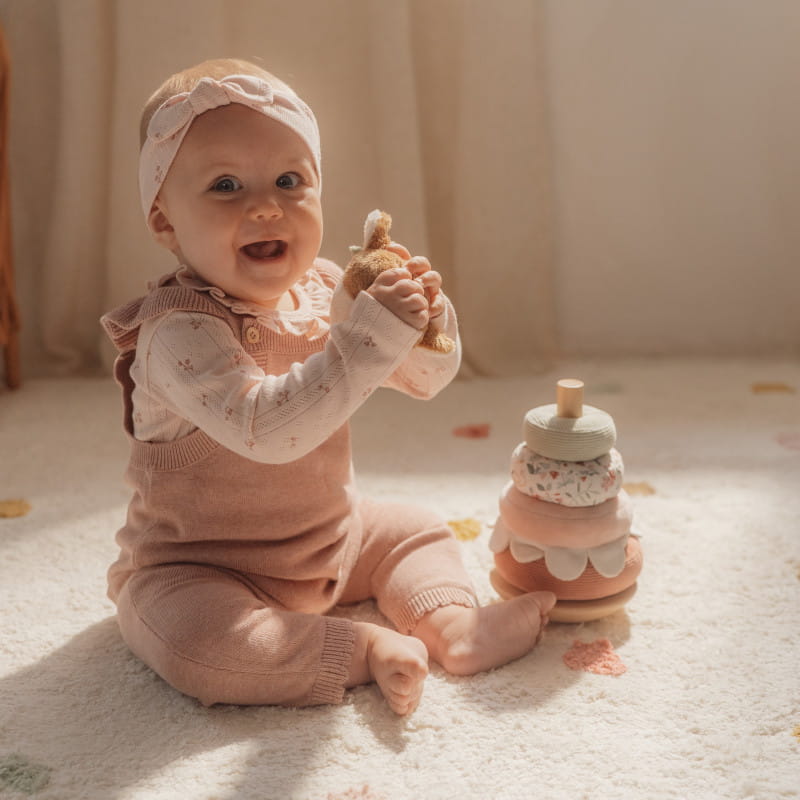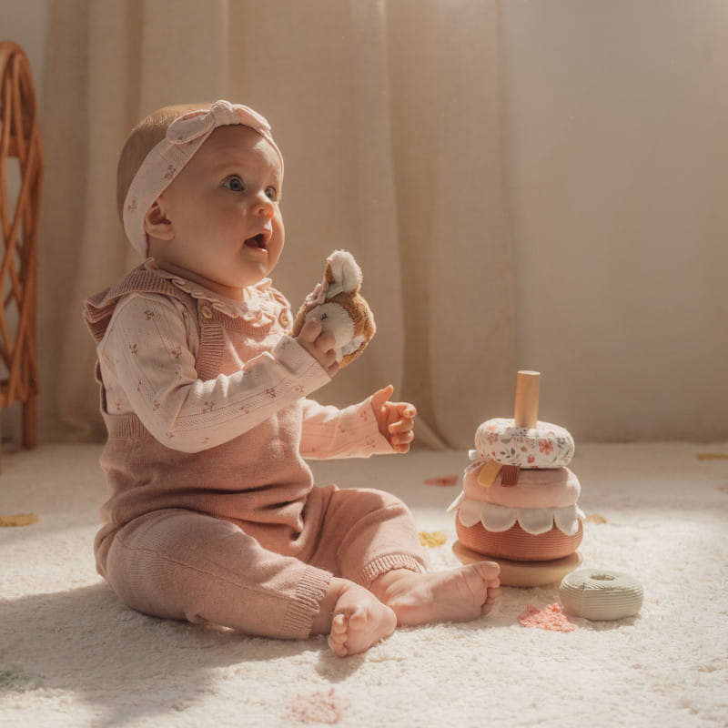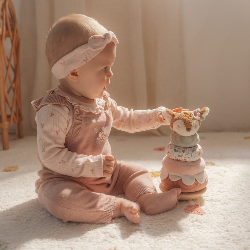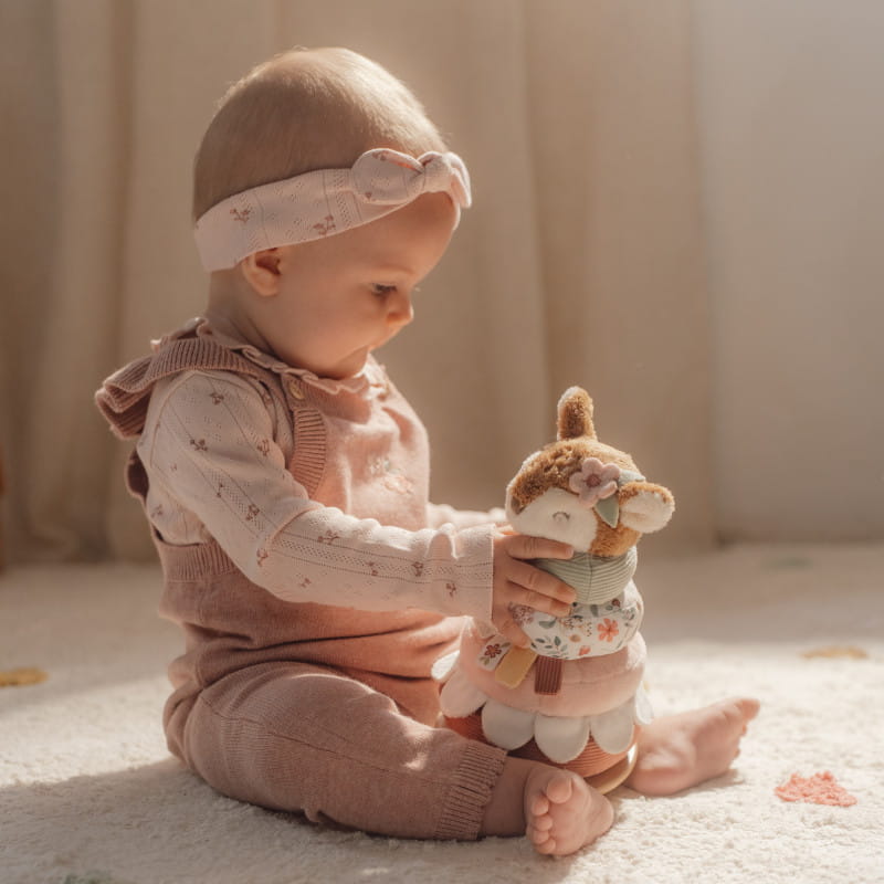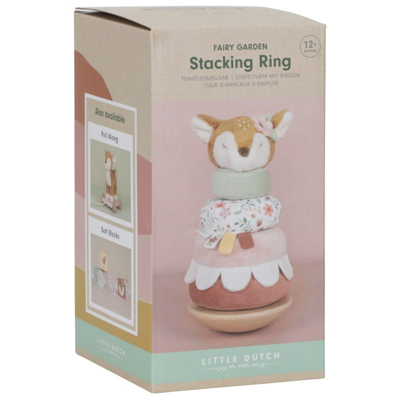 Układanie miękkich pierścieni na drewnianej podstawie, która kołysze się w przód i w tył, to nie lada wyzwanie. Urocza Sarenka zachęca maluchy do wytrwałości, aby zawirować w tańcu po ułożeniu piramidy. Każdy miękki pierścień ma unikalny wzór inspirowany kolekcją Fairy Garden.