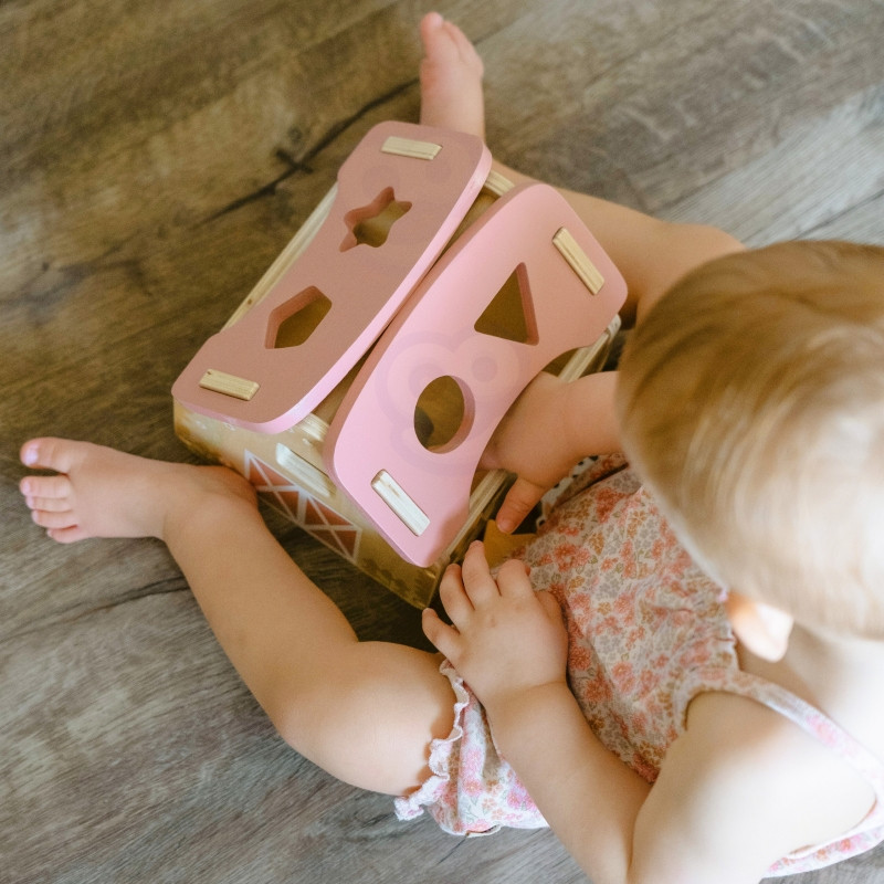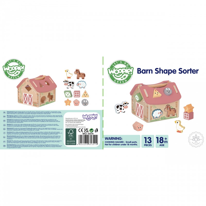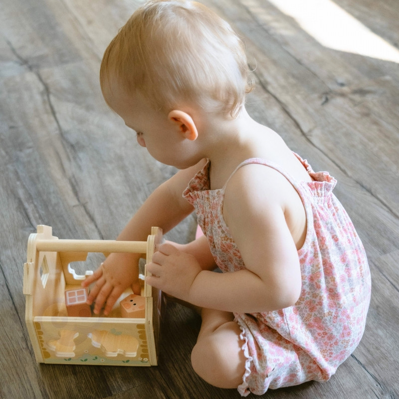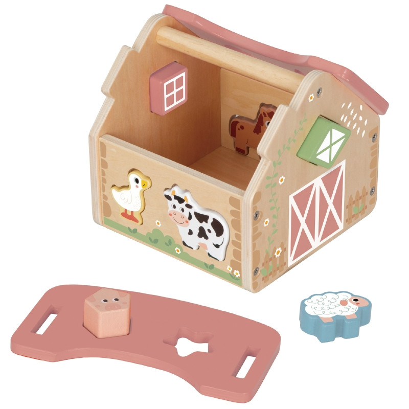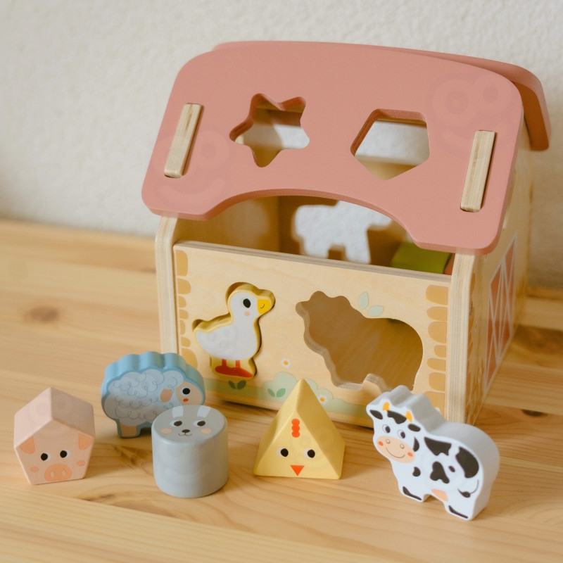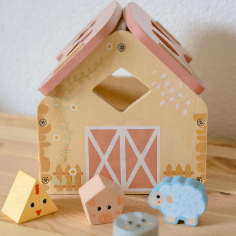 Zabawa polega na dopasowywaniu drewnianych zwierzątek i klocków do odpowiednich otworów w ścianach stodoły. Maluch ćwiczy przy tym koordynację wzrokowo-ruchową, cierpliwość i koncentrację. Uczy się przez działanie – a to najlepszy sposób na trwałą naukę.