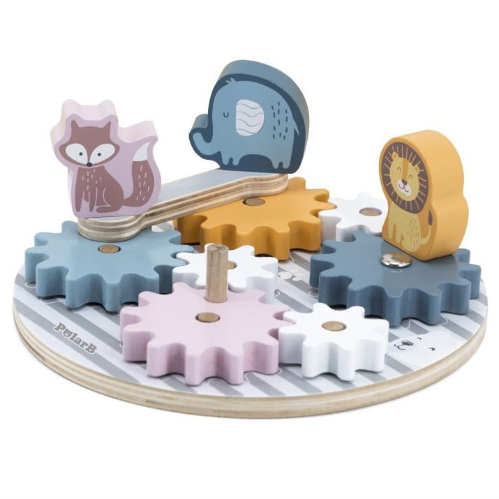 Atrakcyjna układanka z obracającymi się zębatkami i sympatycznymi zwierzątkami - słoniem, lwem i liskiem. Koła z zębatkami są różniej wielkości i można układać je w dowolny sposób. Obrót kół można modyfikować, łącząc je przy pomocy specjalnej, dołączonej osi. Zwierzątka można nakładać na paliki lub ustawiać na zębatkach i wprawiać je w ruch.