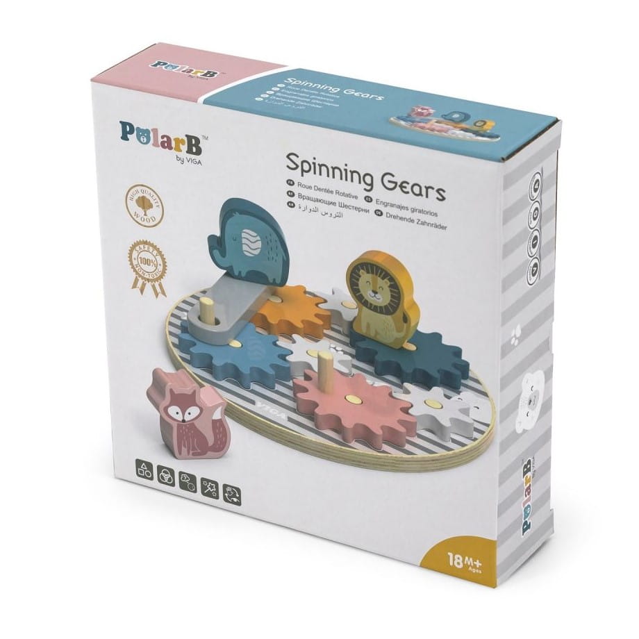 Atrakcyjna układanka z obracającymi się zębatkami od Viga Toys i sympatycznymi zwierzątkami - słoniem, lwem i liskiem. Koła z zębatkami są różniej wielkości i można układać je w dowolny sposób. Obrót kół można modyfikować, łącząc je przy pomocy specjalnej, dołączonej osi. Zwierzątka można nakładać na paliki lub ustawiać na zębatkach i wprawiać je w ruch.