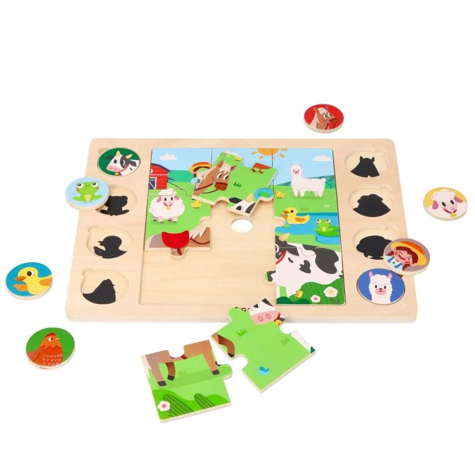 Na środku planszy mamy do ułożenia 9-elementowe drewniane puzzle. Z boku planszy mamy krążki przedstawiające zwierzątka, pod którymi kryją się obrazki przedstawiające ich cienie.