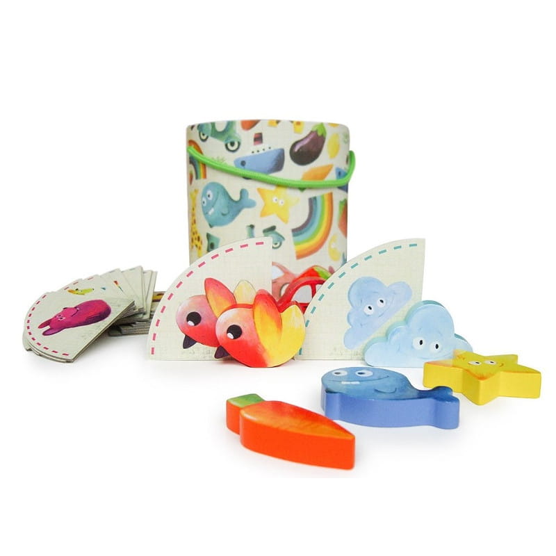 Elementy zestawu znajdują się w specjalnym wiaderku – jest to 21 elementów drewnianych, w tym 1 element pułapka, oraz 20 ilustrowanych kart.