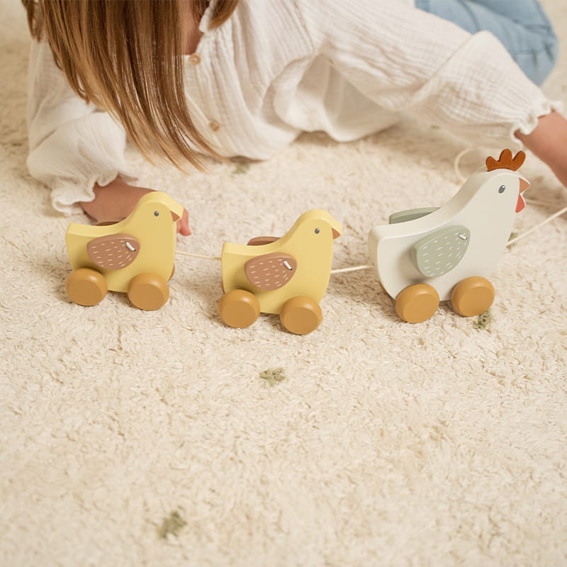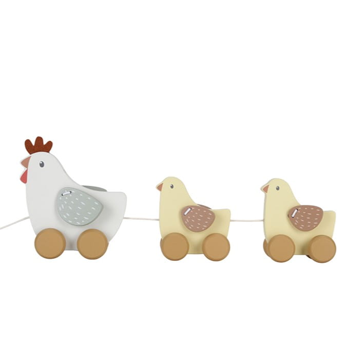 Te urocze drewniane kurki nie mogą doczekać się wspólnych przygód! Pociągnij za sznurek i wyruszaj na wycieczkę razem z nimi.