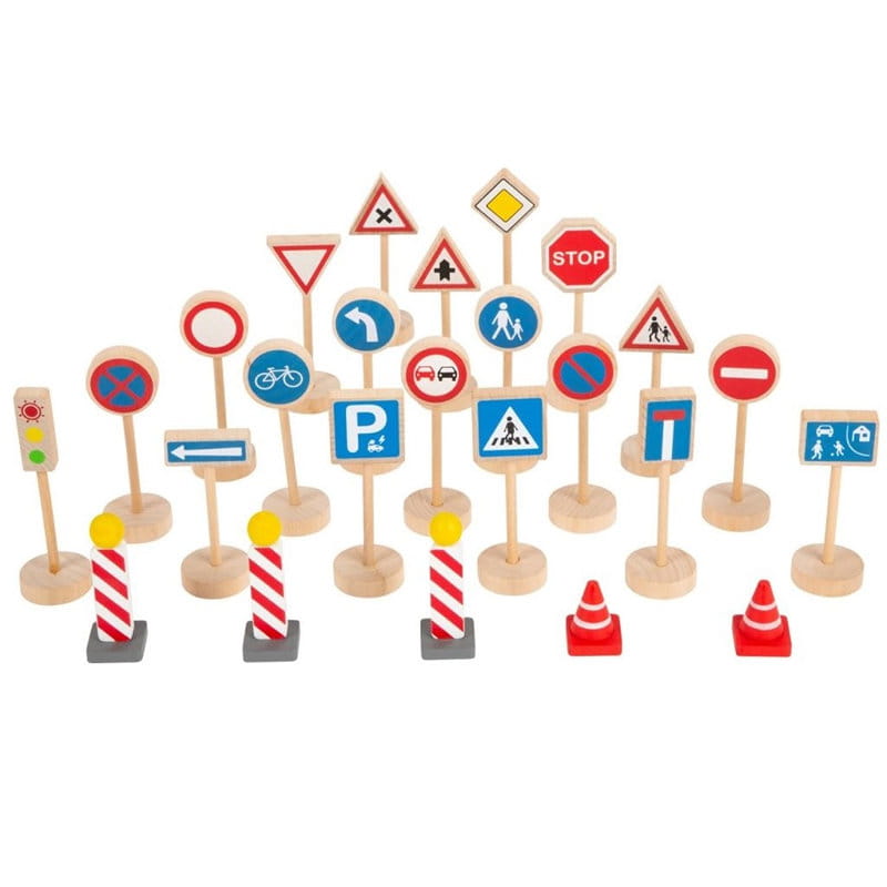 Drewniane znaki drogowe sprawdzą się zarówno w formie edukacji co do zasad ruchu drogowego jak i zapewnią świetną zabawę. Ustawione na podłodze dają niezliczone możliwości podczas zabawy samochodzikami czy pociągami i drewnianymi torami.