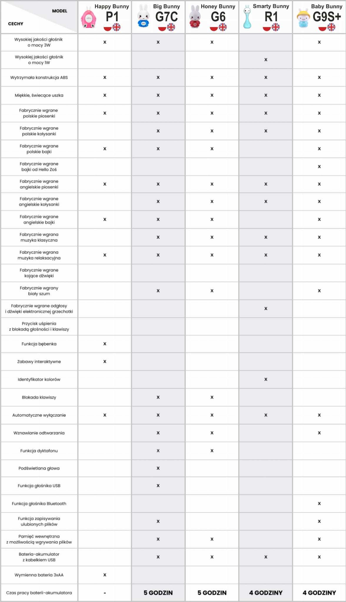 - funkcja bluetooth - bezprzewodowe połączenie Baby Bunny z dowolnym urządzeniem umożliwi odtwarzanie Twojemu dziecku ulubionej muzyki, audiobooków oraz innych utworów