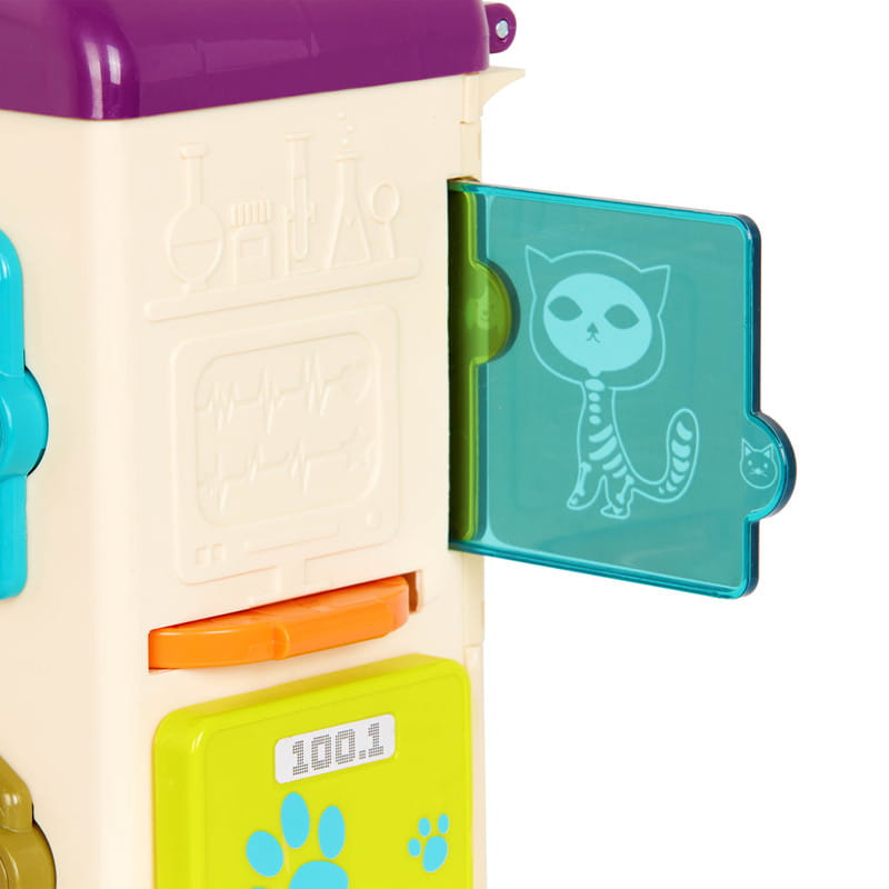 Przenośny szpital dla zwierząt z czterema oddzielnymi salami. Do każdej z sal jest oddzielny, inny kluczyk, uczący dziecko doboru kształtów i kolorów. W komplecie dwaj uroczy pluszowi pacjenci - kotek i piesek oraz zestaw akcesoriów weterynaryjnych.