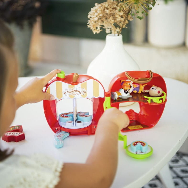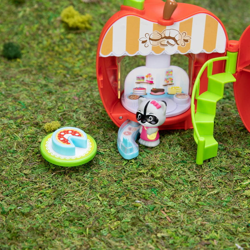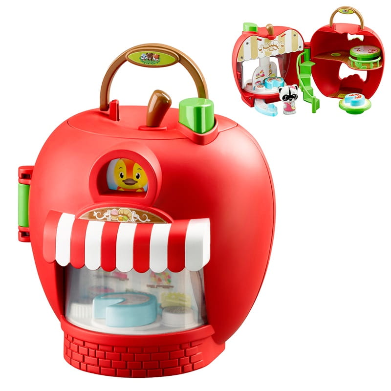 - Zestaw zawiera: Cukiernię Słodkie Jabłuszko ze schodami i wysuwanym blatem z kasą, dwa ciasta, dwa stoliki, jedno zwierzątko.