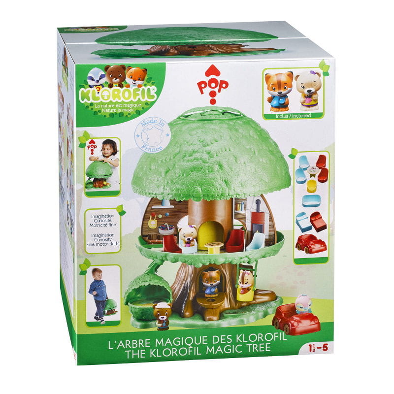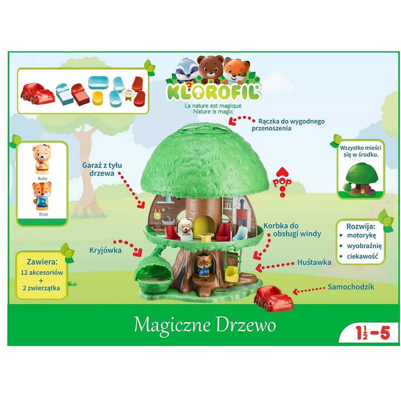 W Magicznym Drzewie Klorofil znajduje się wszystko, czego potrzebują mieszkańcy do wspólnej zabawy i odpoczynku. Liczne elementy pozwalają tworzyć różne scenariusze zabawy, a także rozwijać wyobraźnię dziecka. Dzięki figurkom, mebelkom i dodatkom maluch może odgrywać codzienne przygody sympatycznych zwierzątek. Wszystkie akcesoria zostały zaprojektowane tak, aby idealnie pasowały do wnętrza tej wyjątkowej zabawki. W skład zestawu wchodzi: