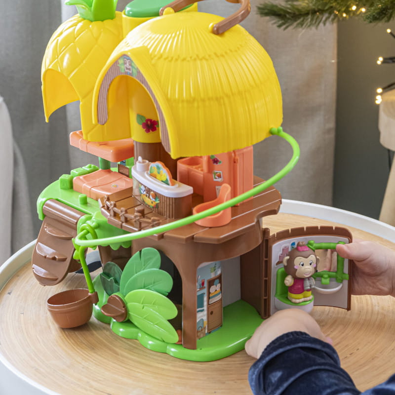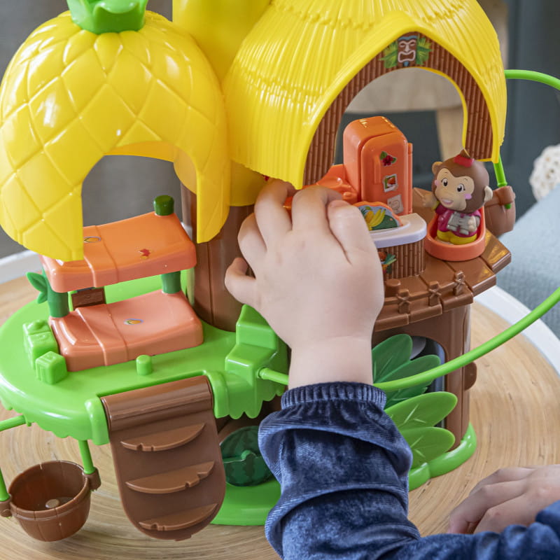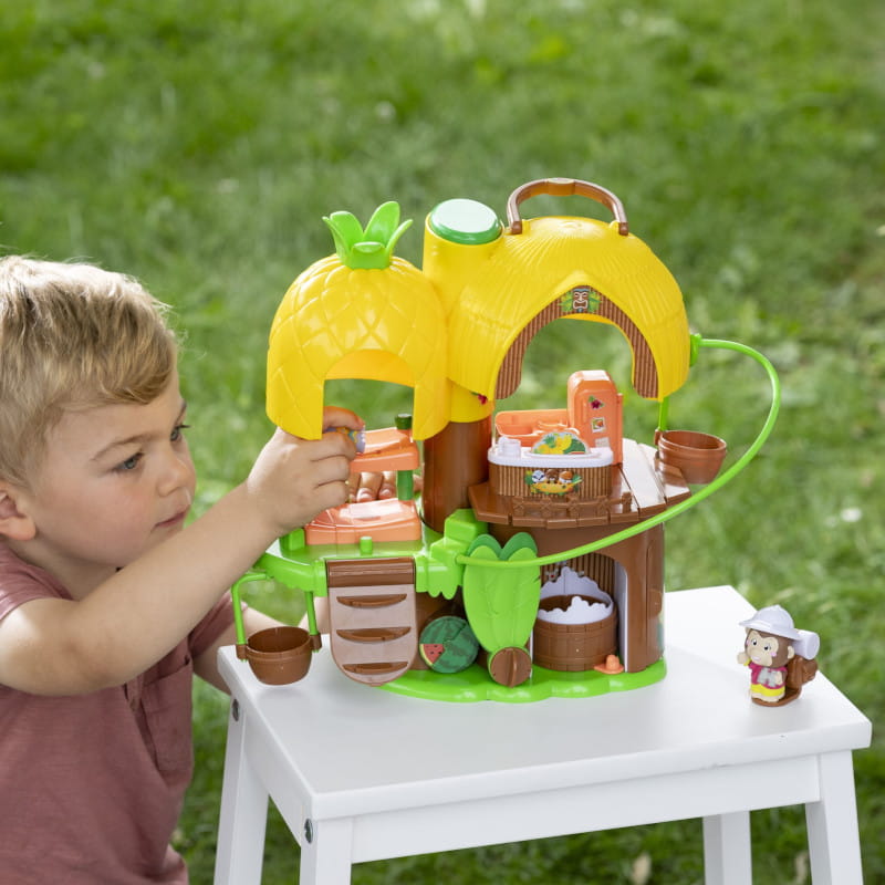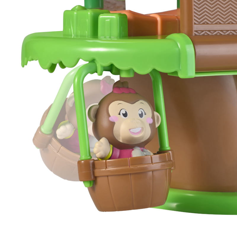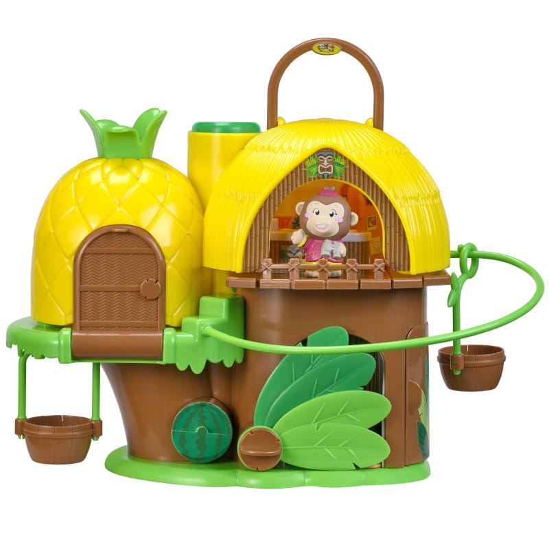 Uroczy domek stoi w tropikalnej, gorącej dżungli, a mieszka w nim uwielbiająca gości małpka. W domku jest łazienka z balią pełną piany dla zwierzątek do kąpieli po długim dniu zabawy, kuchnia z lodówką pełną owoców, sypialna z łóżkiem piętrowym dla dwóch zwierzątek oraz winda na lianie, po której porusza się beczka, w której małpka może wjechać na piętro i zjechać na parter.