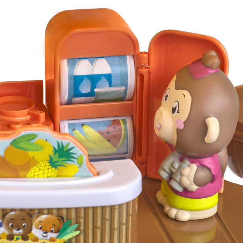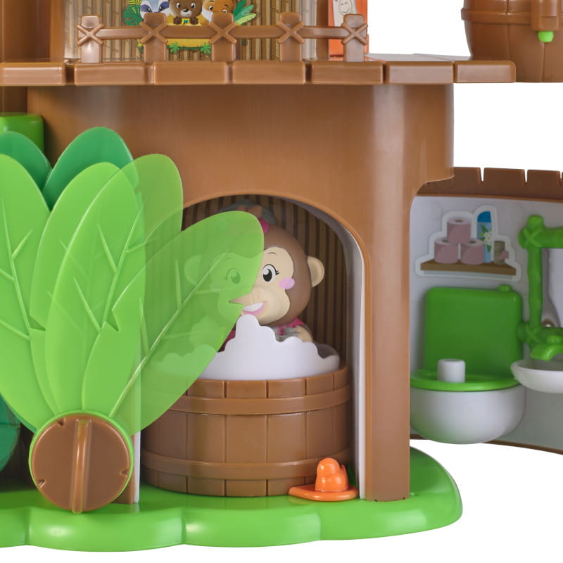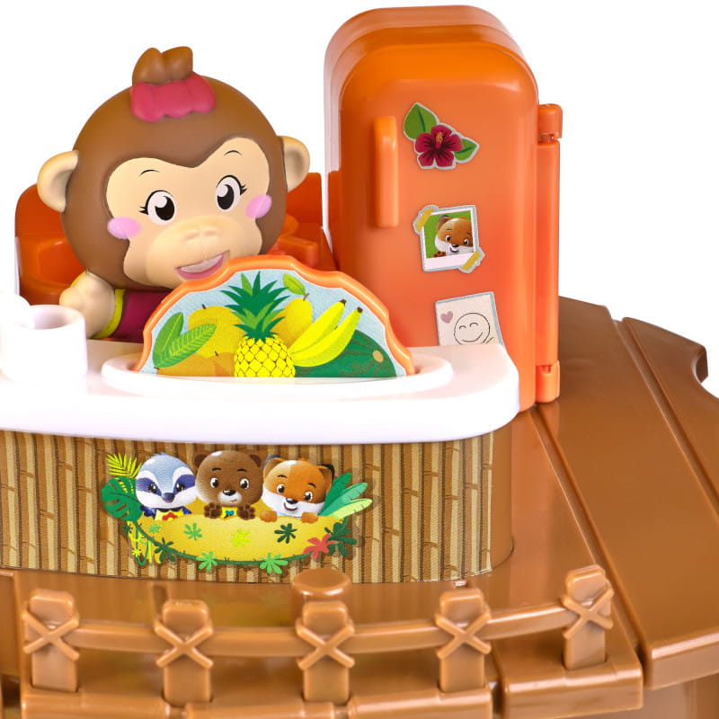 W kuchni małpka może przygotować koktajl owocowy dla swoich przyjaciół, otwórz lodówkę, pokręć wałkiem i wybierz czym jeszcze małpka może poczęstować gości. Łazienka schowana jest za dużymi liśćmi, nikt nie będzie mógł podejrzeć kąpiących się w dużej pianie zwierzątek. Przyjaciele do domku mogą wejść po schodach, które prowadzą do sypialni lub wjechać po lianie do kuchni.