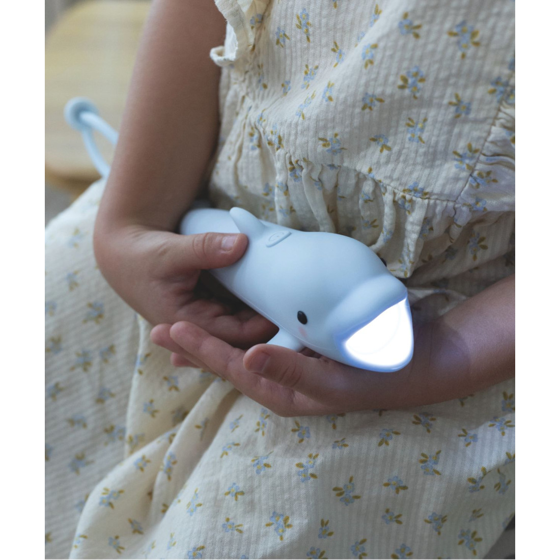 Latarka marki Rabbit & Friends w kształcie delfina, pokryta miękkim silikonem, to połączenie zabawy i funkcjonalności.