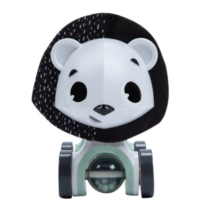 - Szeleszczące uszy, wirująca kula z koralikami oraz dźwięk kliknięcia, gdy głowa jest obracana, motywują dziecko do odkrywania i zabawy.