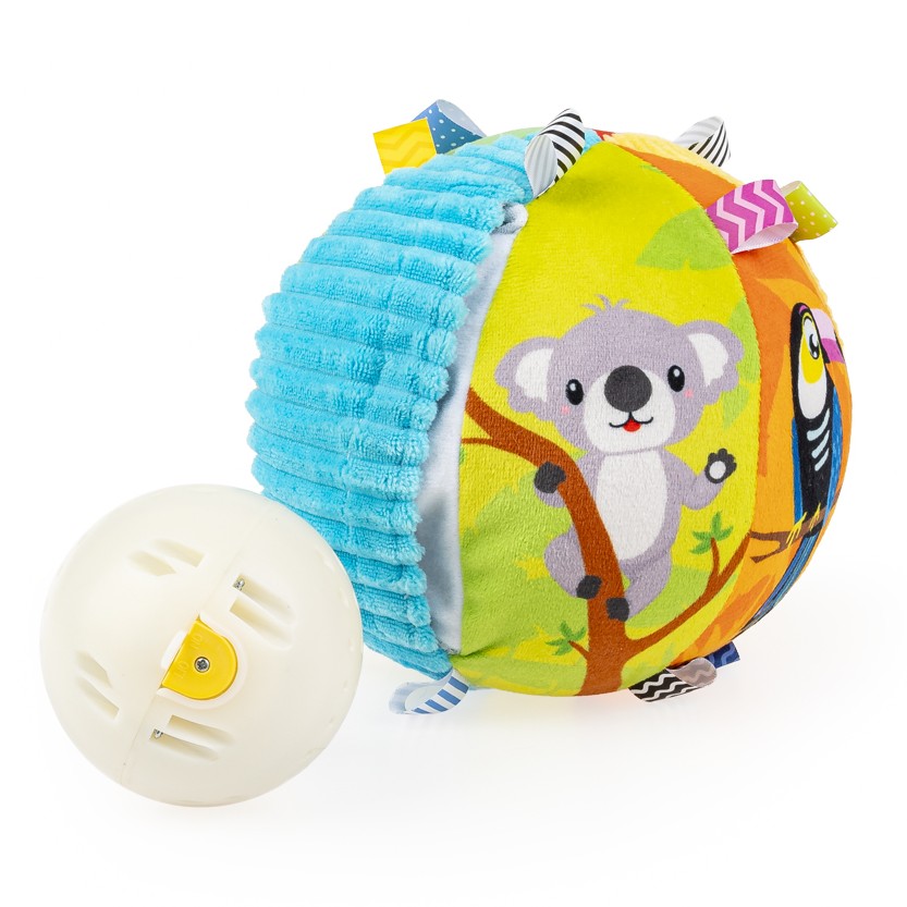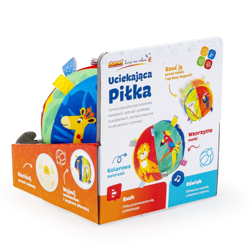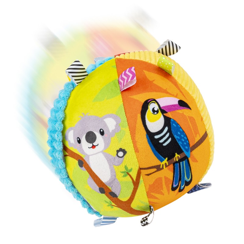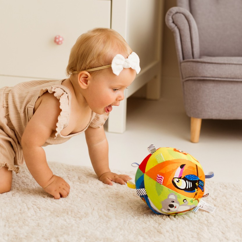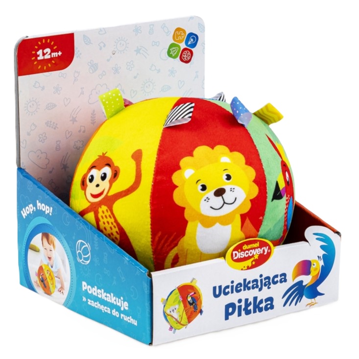 Kolorowa, materiałowa piłeczka ucieka w podskokach, zachęcając maluchy do ruchu.