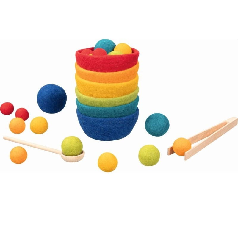 W zestawie znajdują się ręcznie filcowane kuleczki z czystej wełny i pasujące do nich kolorowe, filcowe miseczki, które dziecko może segregować przy pomocy drewnianych szczypiec i łyżeczki, doskonale dopasowanych do dziecięcych rączek.