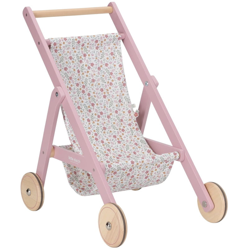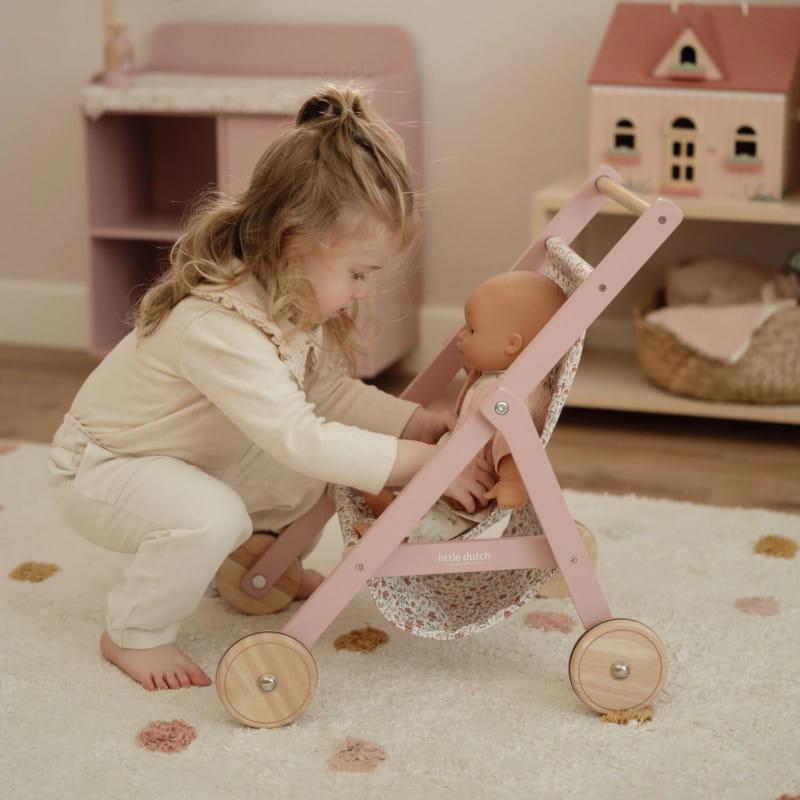 Piękna, drewniana spacerówka dla lalek spodoba się każdej dziewczynce. Bardzo ładnie wykonany, posiada różową ramę i wygrawerowane logo Little Dutch. Solidna rama jest pięknie wykończona, a drewniane koła mają gumową krawędź dla dodatkowej ochrony powierzchni i bezpieczeństwa.