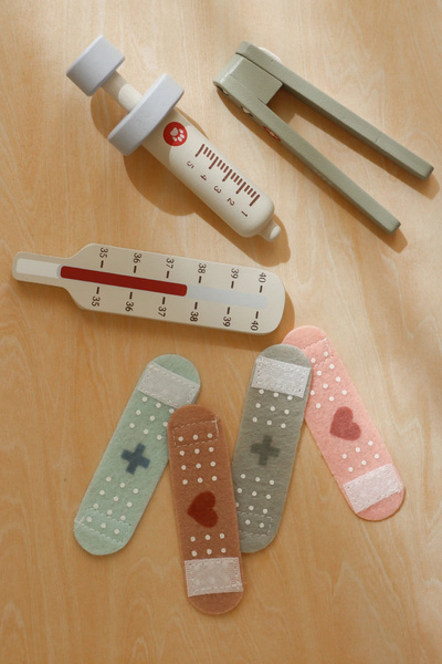Mnóstwo akcesoriów do badania takich jak: czapka weterynarza, kołnierz, termometr, zastrzyki, pęsetka, plasterki, miarka czy opcja zrobienia rentgenu i prezentacja wyników na przypiętych kartach.