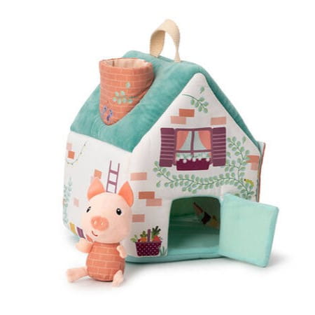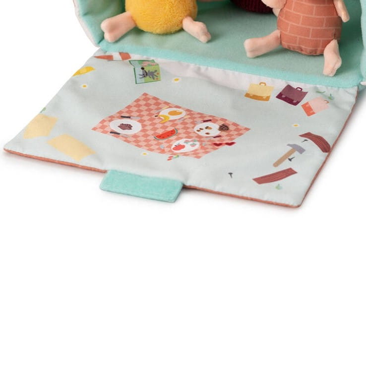 Wszystkie elementy są miękkie i uszyte z materiałów o różnorodnych fakturach i wzorach. Domek ma wygodną rączkę do przenoszenia.