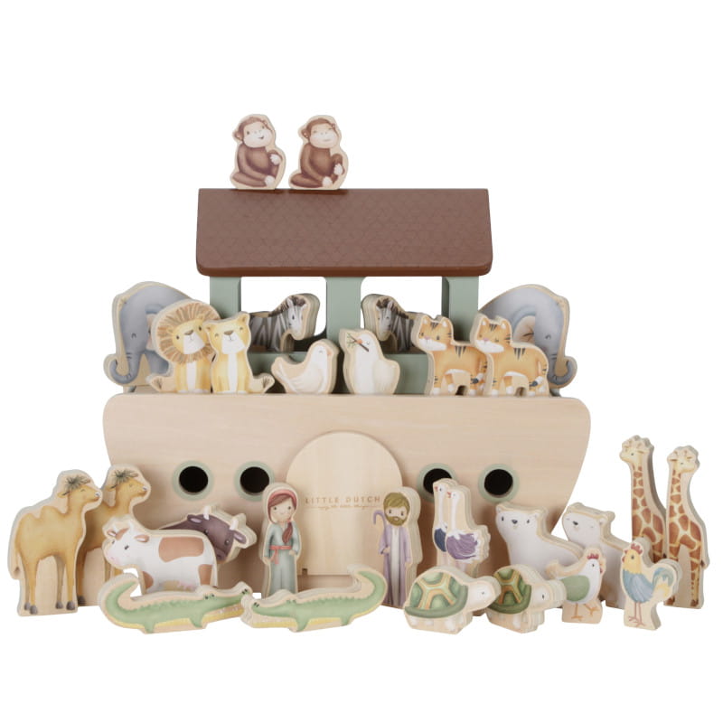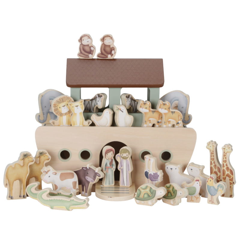 Zestaw zawiera 25-elementów: statek-Arkę z pokładem, który można podnieść, aby zabrać wszystkie zwierzęta. Noe zabiera swoją żonę i dużą grupę zwierząt w podróż przez ocean: 2 lwy, 2 słonie, 2 zebry, 2 małpy, 2 gołębie, 2 krokodyle, 2 żółwie, 2 żyrafy, 2 strusie, 2 krowy, kurę i koguta.