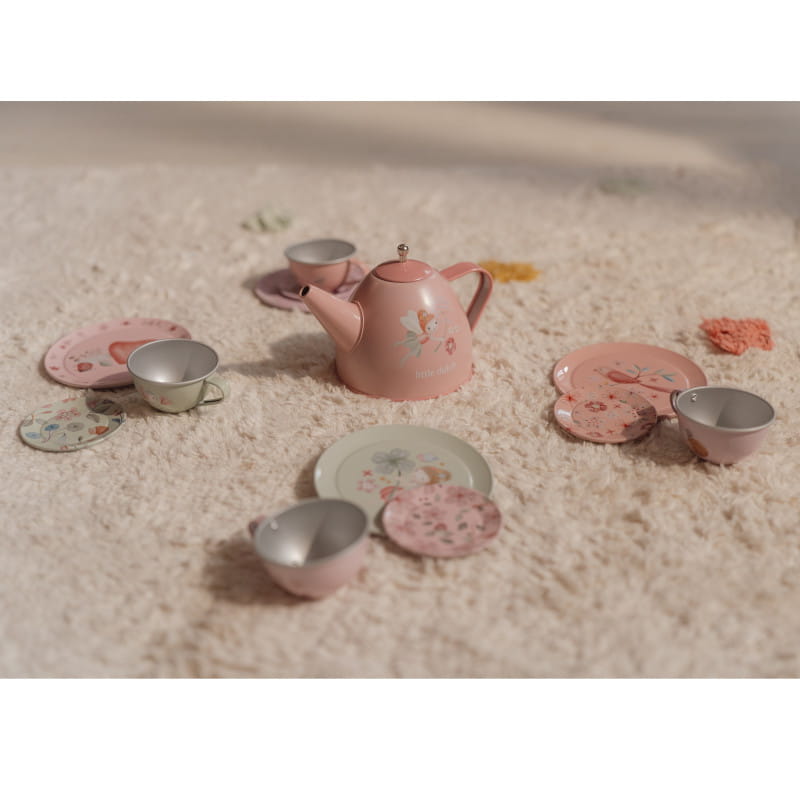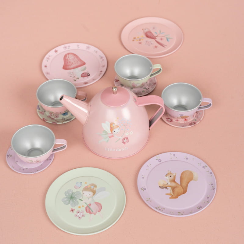 Piękny metalowy zestaw do herbatki lub kawy z kolekcji Fairy Garden ozdobiony kwiatami i zwierzątkami.