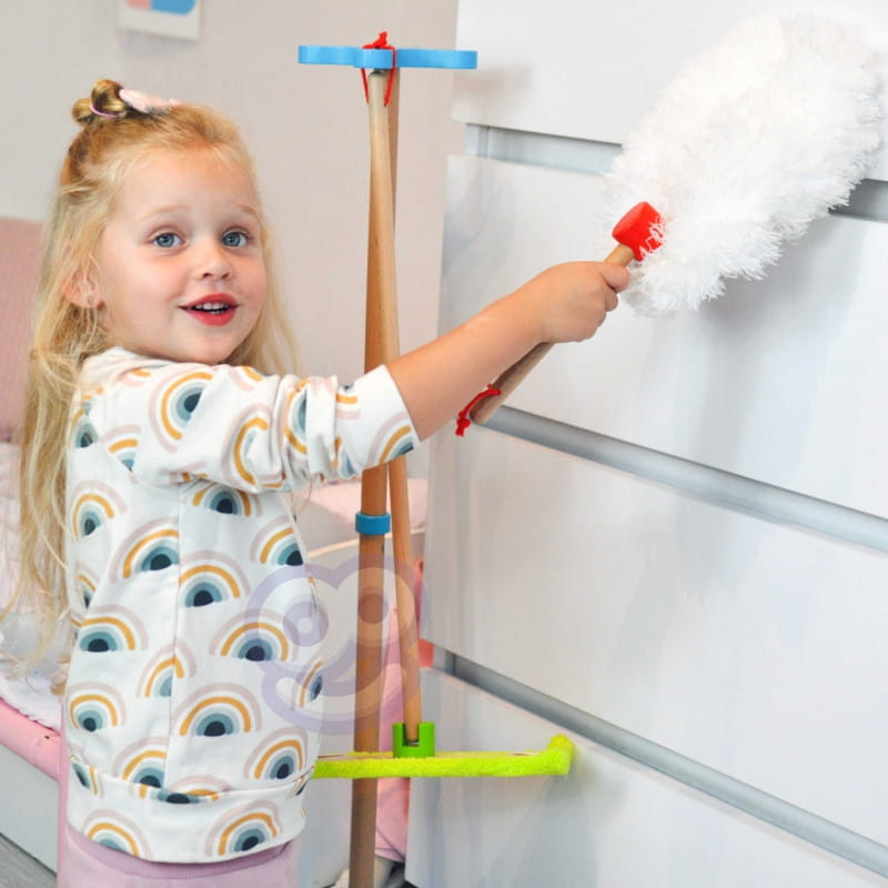 Przedmioty można łatwo przechowywać za pomocą stojaka z niebieską podstawą, na którym można je zawiesić. Dzięki zestawowi do sprzątania dziecko nauczy się sposobu, w jaki należy używać poszczególnych przedmiotów. Maluch nauczy się dbać o porządek i czystość w swoim pokoju.