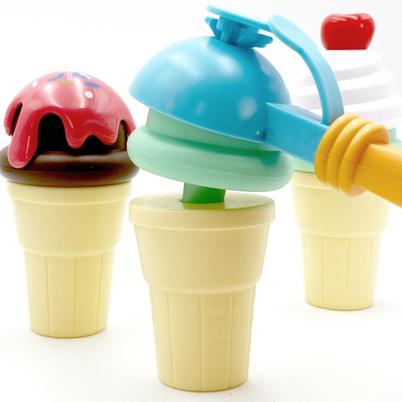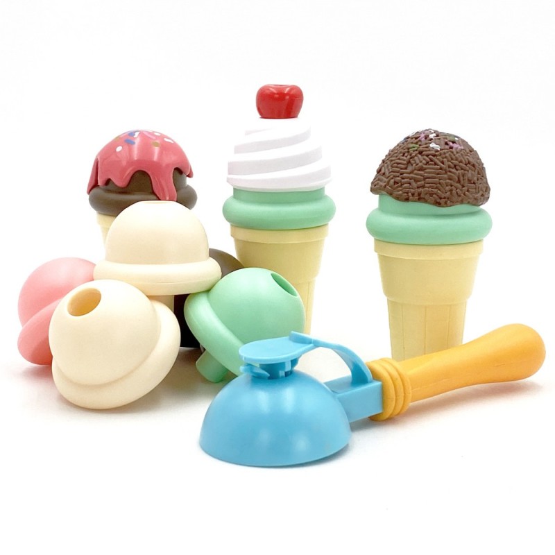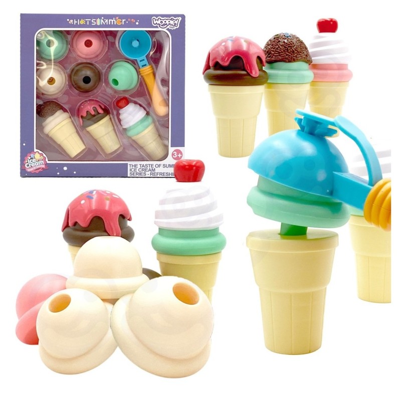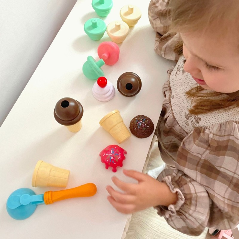 W zestawie znajdują się wafelki, kulki, łyżkę do nakładania i extra dodatki. Dziecko bierze wafelek, nakłada na łyżkę dowolną gałkę i układa według swojego uznania. Prosta zabawa, a pozwoli rozwinąć wyobraźnie i kreatywność Twojego dziecka. Dziecko może wcielić się i odegrać role cukiernika i klienta z przyjaciółmi lub rodziną.