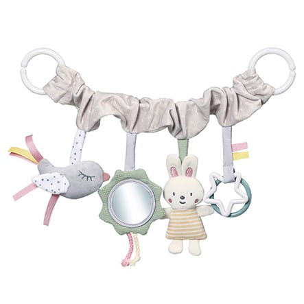 Na pokrytej przyjemnym w dotyku materiałem zawieszce umieszczono grzechoczącego ptaszka, bezpieczne lusterko z wystającymi sznureczkami, szeleszczącego króliczka oraz kółko i gwiazdkę.