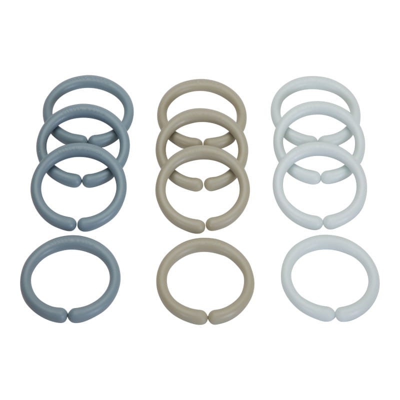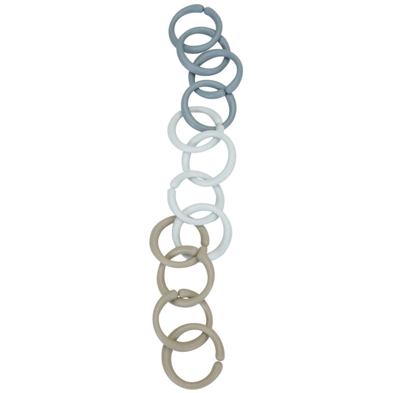 W zestawie znajduje się 12 wielofunkcyjnych kółeczek. Można z nich zrobić łańcuszek do przymocowania np. książeczki spacerowej lub innej zabawki do wózka, gondoli lub zawiesić ulubioną zabawkę dziecka na foteliku samochodowym.