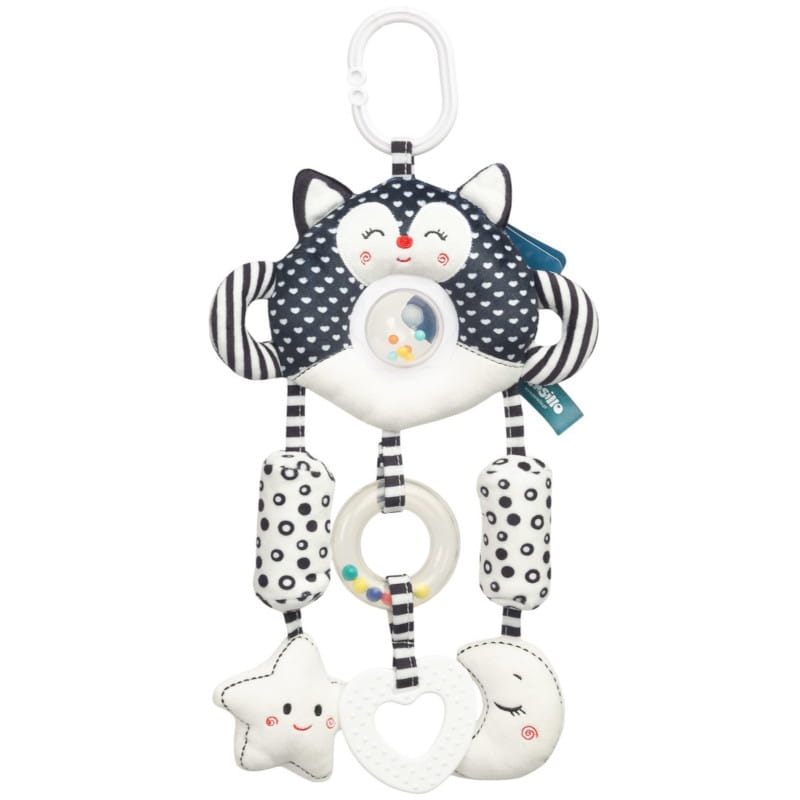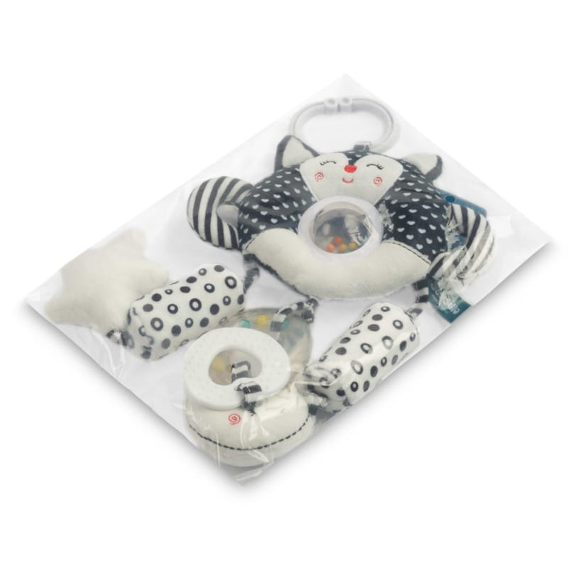 Zabawka wykonana jest z miękkich, miłych w dotyku materiałów w kontrastowych kolorach, które zachęcą maluszka do zabawy z dołączonymi zawieszkami sensorycznymi.