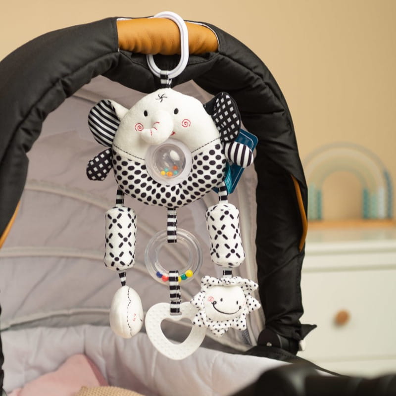 Dzięki wygodnemu, uniwersalnemu uchwytowi łatwo zamocujesz ją na wózku, foteliku samochodowym lub łóżeczku, co sprawia, że zabawka jest zawsze pod ręką.