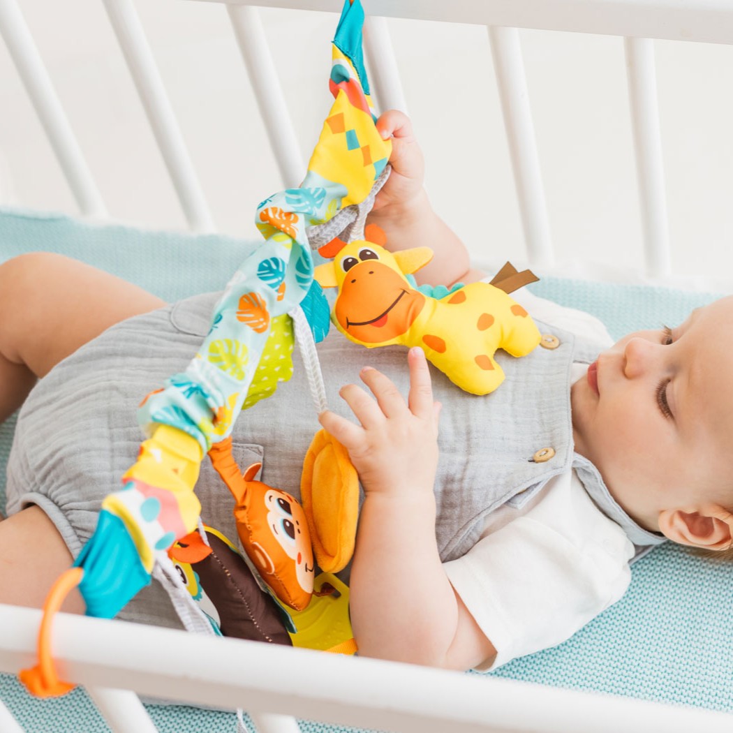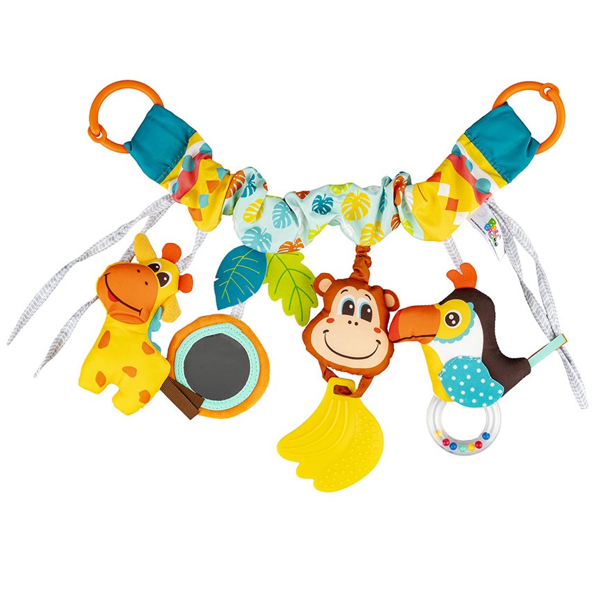 Taśmę zdobi bezpieczne lustereczko, służące do samopoznania bobasa, miękki gryzaczek w kształcie kiści bananów, dzwoneczek w kształcie żyrafy i grzechoczące kółeczko przymocowane do materiałowego tukana.