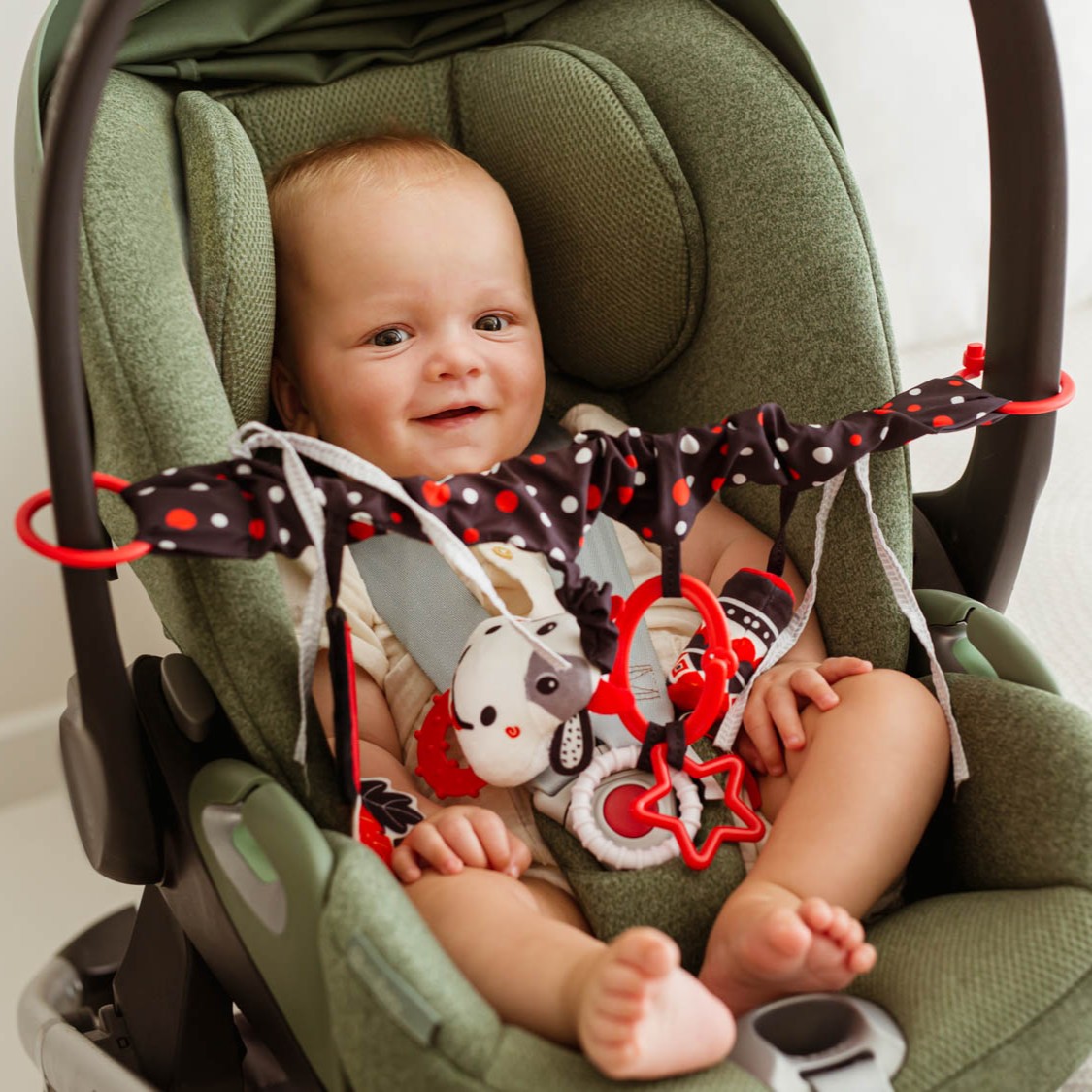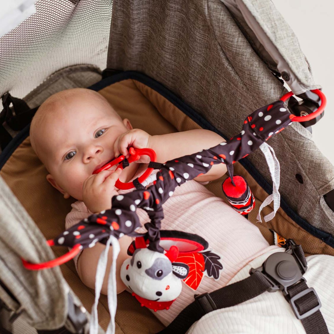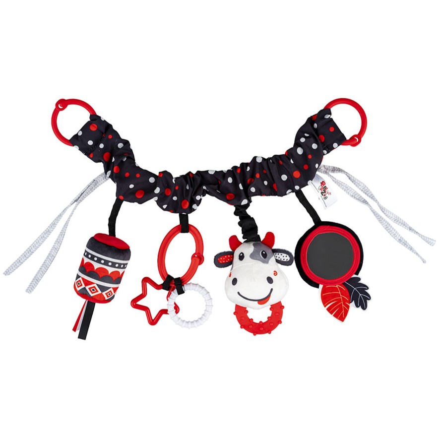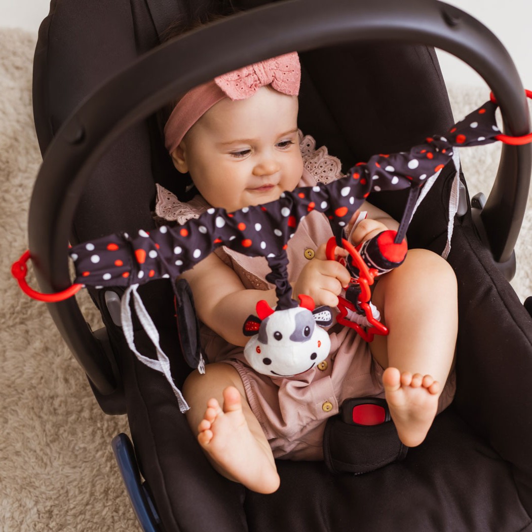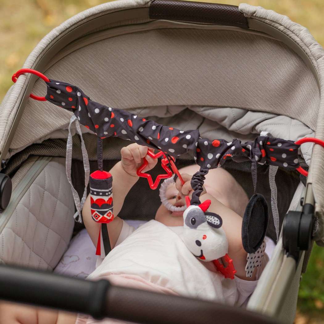 Kontrastowa zabawa w zasięgu ręki bobasa! Ta praktyczna zawieszka, wyposażona w elastyczną taśmę, dwa rodzaje mocowań (zapinane kółka oraz wiązane tasiemki) i cztery różne zabawki, sprawdzi się zarówno w domu, jak i na spacerze.