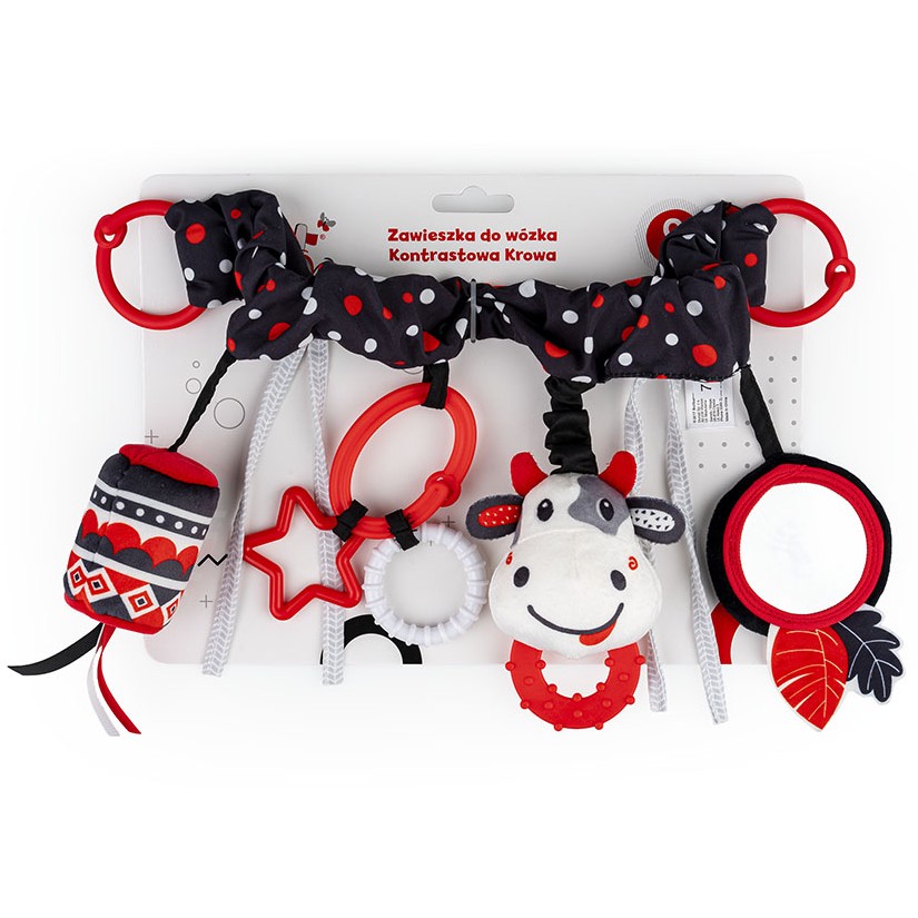 Znajdziemy tu bezpieczne lusterko do samopoznania dziecka, materiałową głowę krówki z gryzaczkiem, dzwoneczek, a także twarde kształty, zawieszone na odczepianym kółeczku.
