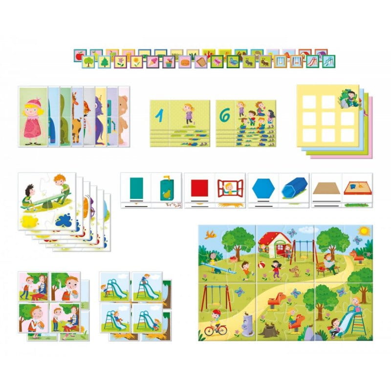 Zestaw zawiera wiele gier uczących kształtów, kolorów, liczb i wielkości.