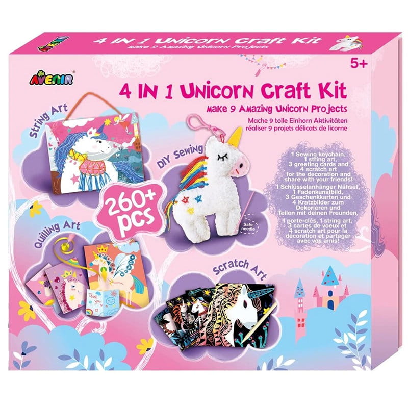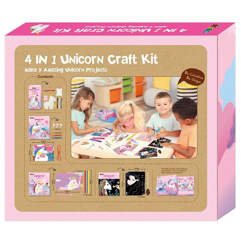 Zestaw artystyczny składający się z kilku technik artystycznych. Dzięki niemu dziecko uszyje breloczek z jednorożcem, wykona urocze kartki metodą quillingu, obrazki metodą opartą na przeplataniu sznurka oraz zatraci się w zdrapywankach.