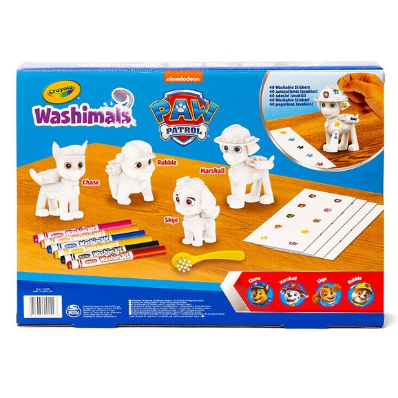 W komplecie znajdują się figurki – główni bohaterowie z bajki Psi Patrol, które można kolorować za pomocą dołączonych zmywalnych flamastrów. Gdy nadejdzie czas na odświeżenie wyglądu, wystarczy umyć je w wodzie, aby po wyschnięciu rozpocząć zabawę od nowa. Dołączone zmywalne naklejki umożliwiają dodatkowe ozdabianie figurek i tworzenie własnych wersji ulubionych postaci.