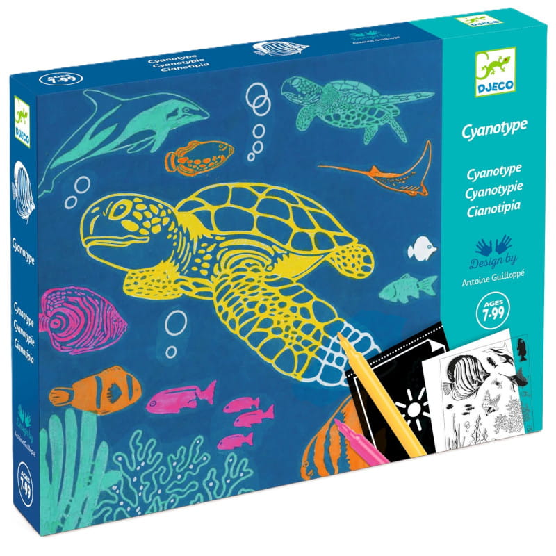 Zestaw artystyczny OCEAN marki Djeco oferuje zabawę techniką fotograficzną o nazwie cyjanotypia.