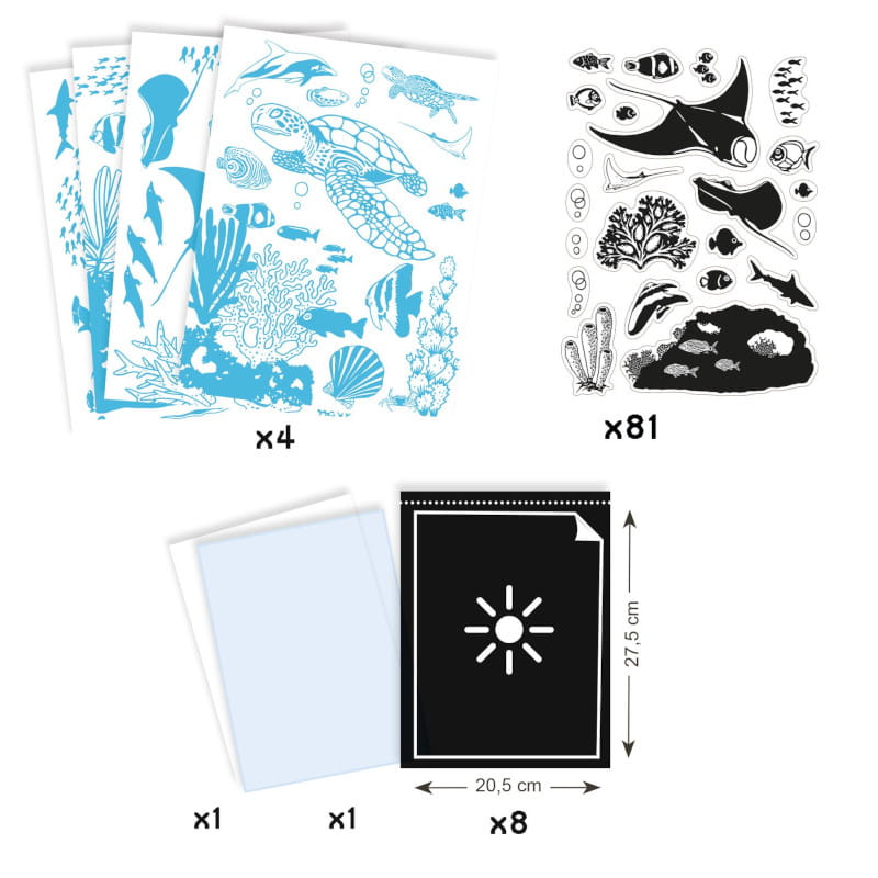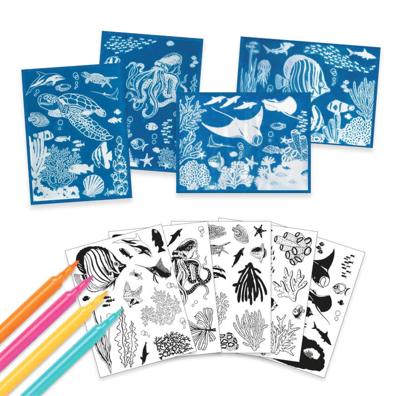 Wzory inspirowane naturą pozwalają stworzyć cztery prawdziwe dzieła sztuki przedstawiające podwodny świat. Dzięki załączonym mazakom można pokolorować powstałe rysunki.