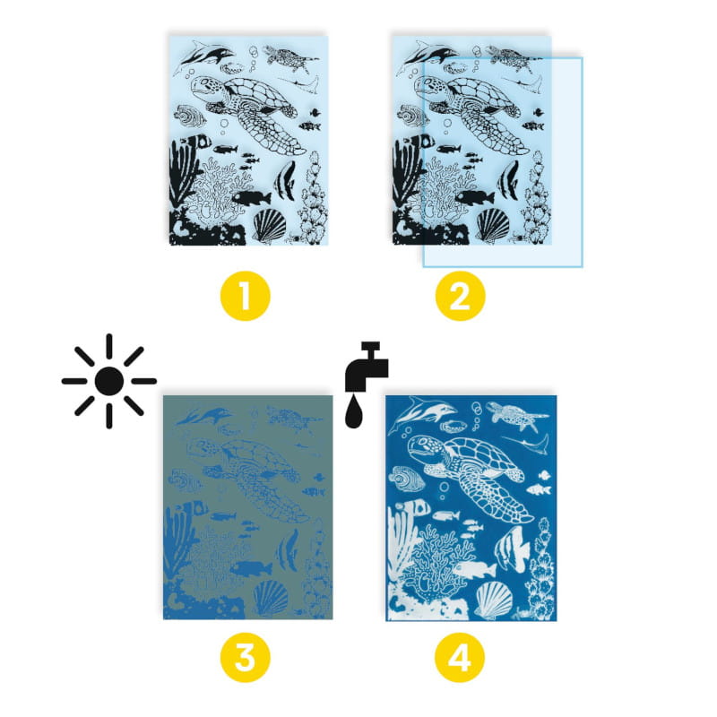 Wykorzystując wybrane przez siebie nieprzezroczyste wzory, dziecko tworzy scenki na papierze światłoczułym. Po wystawieniu na działanie słońca, papier jest znakowany negatywowymi wzorami. Wystarczy opłukać papier w kąpieli z czystą wodą, a scena ukaże się na niebieskim tle!
