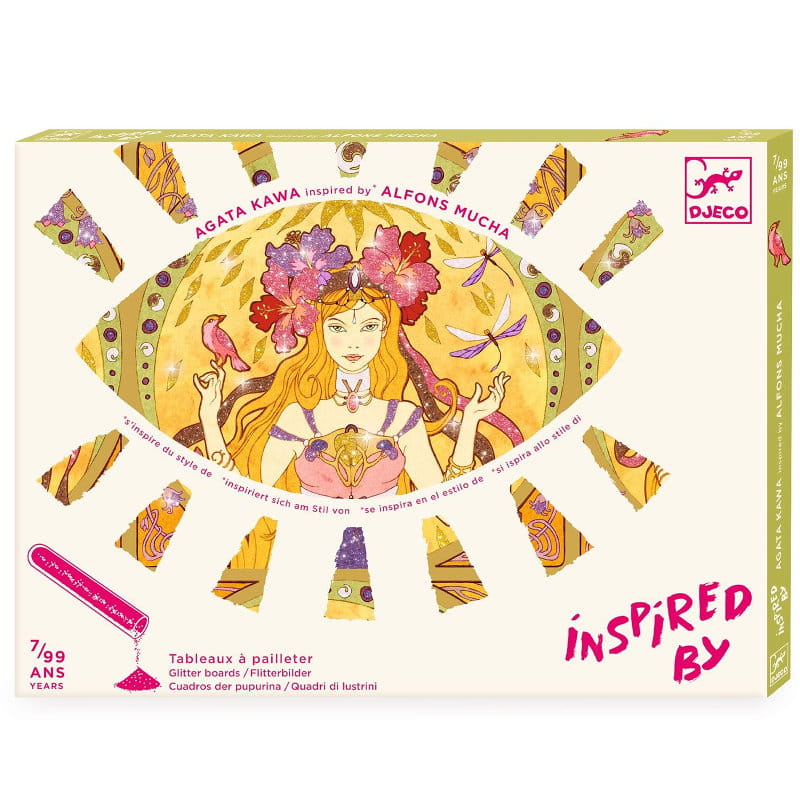 Zestaw do wykonania brokatowego kolażu, który oferuje odkrycie twórczości Alfonsa Muchy, czeskiego grafika i malarza, jednego z czołowych przedstawicieli secesji i fin de siècle’u.