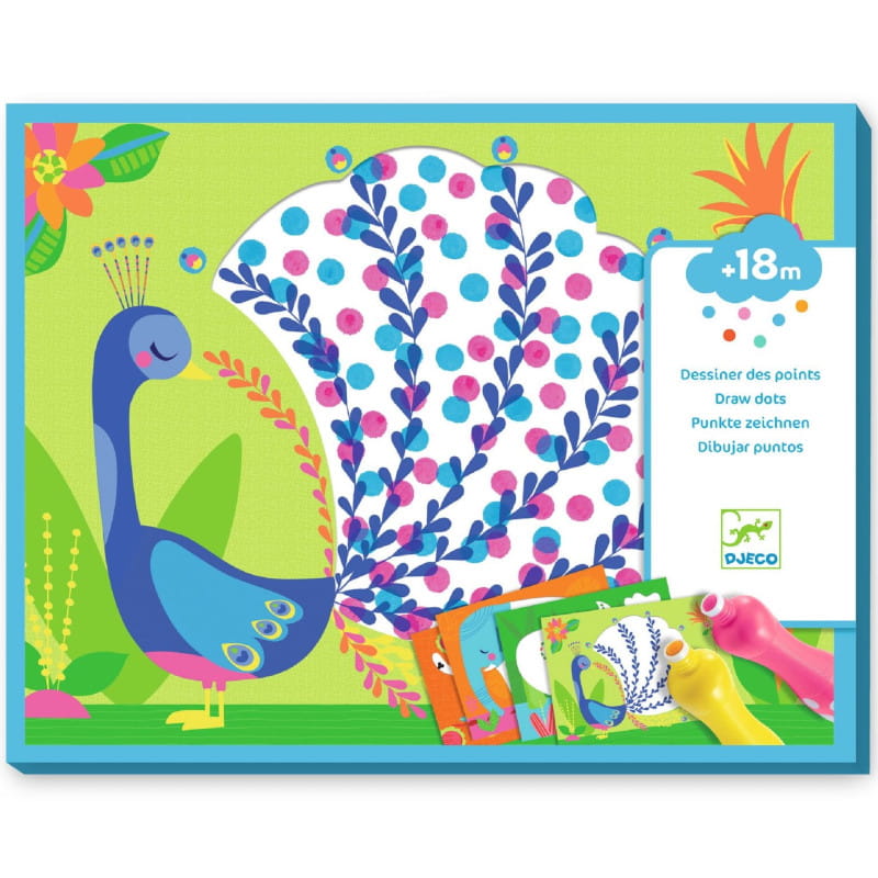 Punkt po punkcie umieść kolor na ilustrowanych kartach. Paw, krokodyl, słoń i gepard czekają na zielone, niebieskie, różowe lub żółte kropki. Flamastry mają kształt wygodny dla małych rączek. Tusz łatwo się spiera lub ściera z blatu biurka np. za pomocą wilgotnej chusteczki.