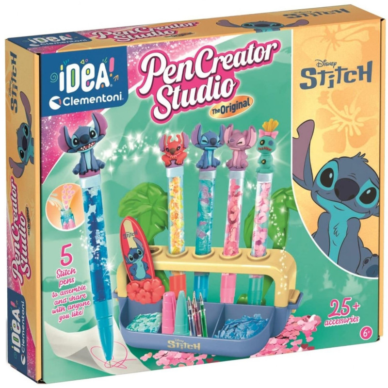 Praktyczny pulpit i bogaty zestaw narzędzi do personalizowania swoich długopisów wieloma dodatkami i sympatycznymi postaciami z bajki o Stitchu.