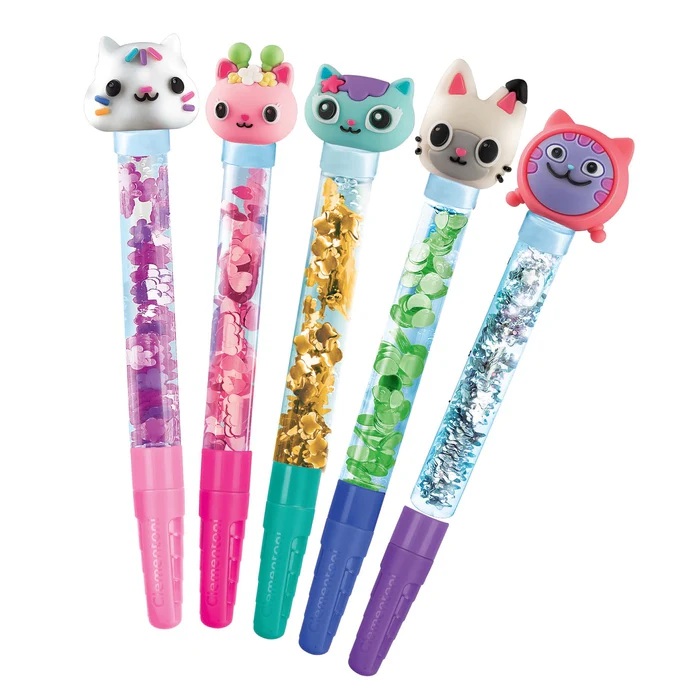 Zestaw zawiera 5 długopisów z odpowiednimi postaciami, kolorowe tusze, połyskujące ozdoby, naklejki do personalizowania pulpitu oraz wszystko, co jest potrzebne, aby puścić wodze własnej wyobraźni.