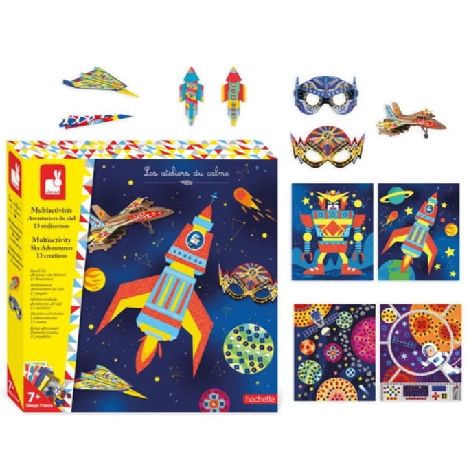 Multizestaw kreatywny Podniebne przygody francuskiej marki JANOD zawiera różnorodne, kolorowe elementy, z których można utworzyć aż 13 przepięknych ozdób do dziecięcego pokoju!