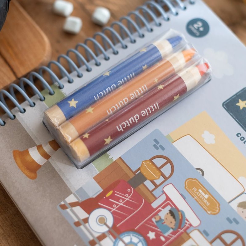 W zestawie znajdują się 3 miękkie, grube, pierwsze kredki, dopasowane do małych rączek. Całość wykonana jest z wytrzymałego papieru, który zapewnia trwałość i komfort kolorowania.