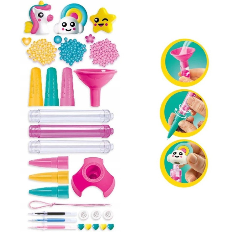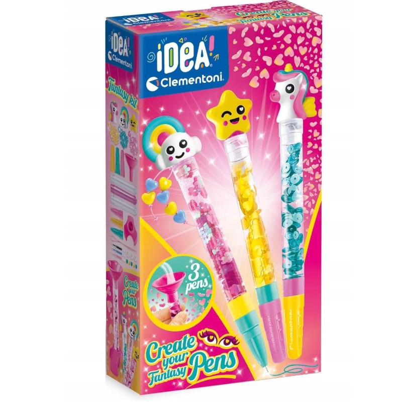 Praktyczny, wieloelementowy zestaw składający się z: długopisów, tuszy w różnych kolorach, figurek i wszystkich narzędzi potrzebnych do ich wykonania.