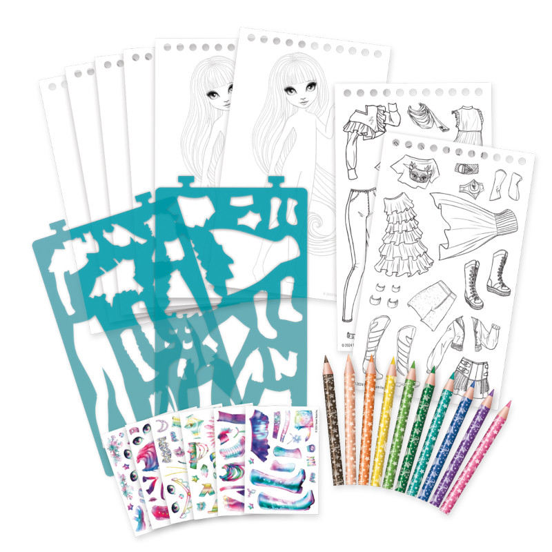 - Bogaty zestaw dodatków – szablony, naklejki, kredki – W zestawie znajdują się 2 arkusze szablonów z aż 28 elementami, 100 modowych naklejek, 10 kolorowych kredek i ilustrowana instrukcja. Dzięki temu dziecko ma wszystko, czego potrzebuje do twórczej zabawy od razu po otwarciu opakowania.